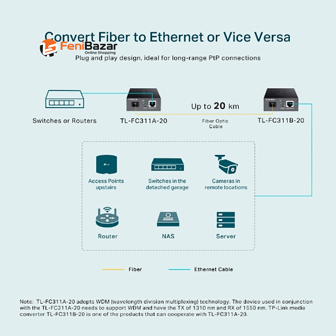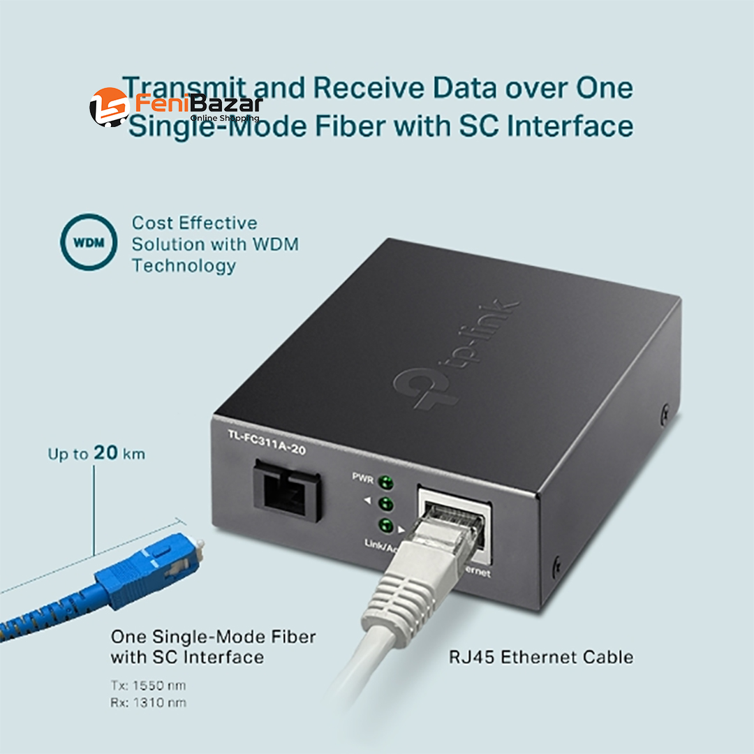 TL-FC311A-20 adopts WDM (wavelength division multiplexing) technology, helping send and receive data at a distance of up to 20 km with only a single mode fiber, which saves half of the cable deployment cost for customers. TL-FC311A-20 transmits data at 1550 nm wavelength and receives data at 1310 nm wavelength on optical fiber. Therefore, the terminal device used in conjunction with the TL-FC311A-20 should send data at a wavelength of 1310 nm and receive data at a wavelength of 1550 nm. TP-Link another media converter TL-FC311B-20 is one of the products that can cooperate with TL-FC311A-20.